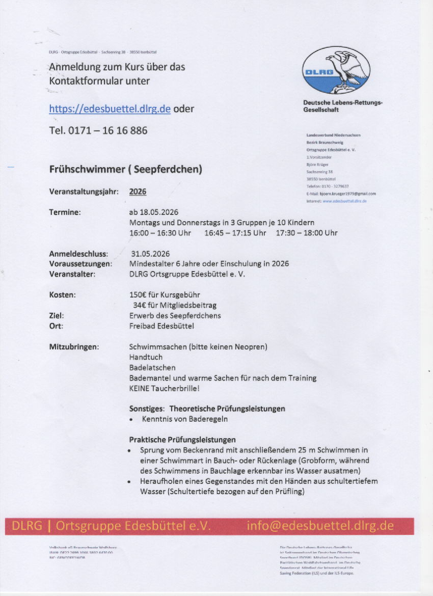 - einmal ca. 2 m Tieftauchen von der Wasseroberfläche mit Heraufholen eines Gegenstandes (z.B.: kleiner Tauchring)